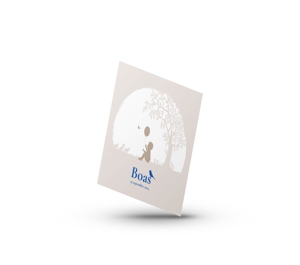 Het geboortekaartje straalt rust en tederheid uit, met een silhouet van een spelend kindje onder een boom, vergezeld door een ballon. De zachte kleuren en natuurlijke illustraties zorgen voor een warme uitstraling. De naam ‘Boas’ springt mooi in het oog in een frisse blauwe kleur, met daaronder subtiel de geboortedatum.
