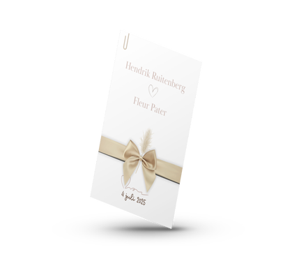 Voor stellen die houden van een stijlvolle en tijdloze uitnodiging, is deze trouwkaart een perfecte keuze. Het ontwerp is rustig en elegant, met in het midden een klassieke gouden strik die meteen opvalt.