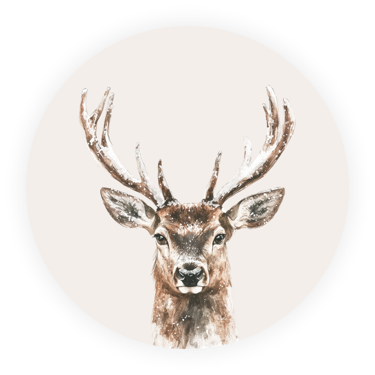 Stijlvolle ronde wenskaart met een prachtig hert, afgebeeld in natuurlijke tinten en subtiele sneeuwaccenten. Perfect voor de winterperiode, als kerstkaart of gewoon om iemand een warme wens te sturen. Tijdloos ontwerp dat past bij iedere gelegenheid.