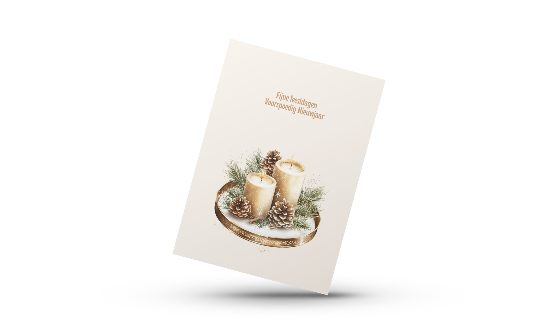 Stijlvolle kerstkaart met kaarsen, dennenappels en wintergroen. Met de tekst "Fijne feestdagen – Voorspoedig Nieuwjaar". Perfect om je warme kerstwensen te versturen. Luxe kerstkaart voor de feestdagen.