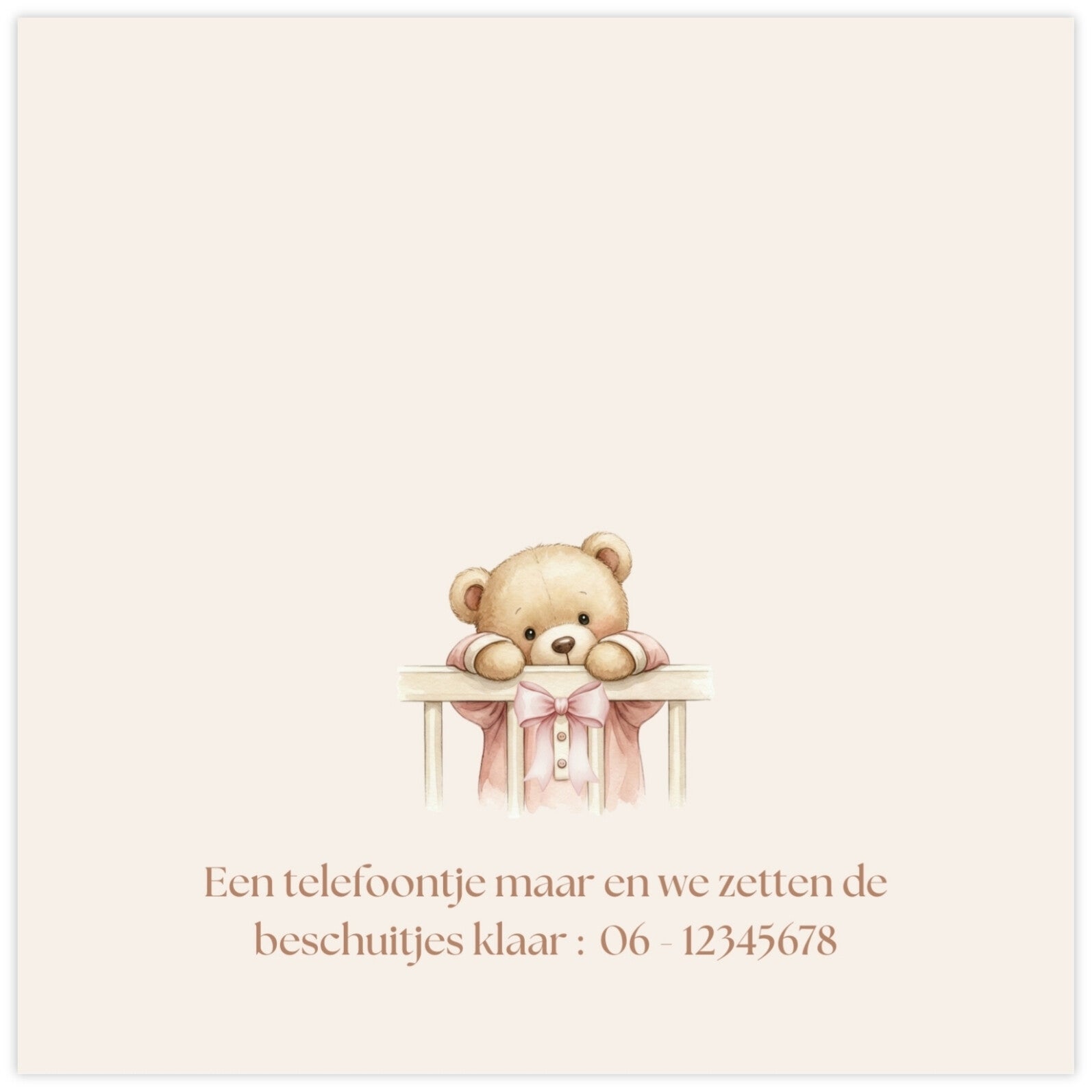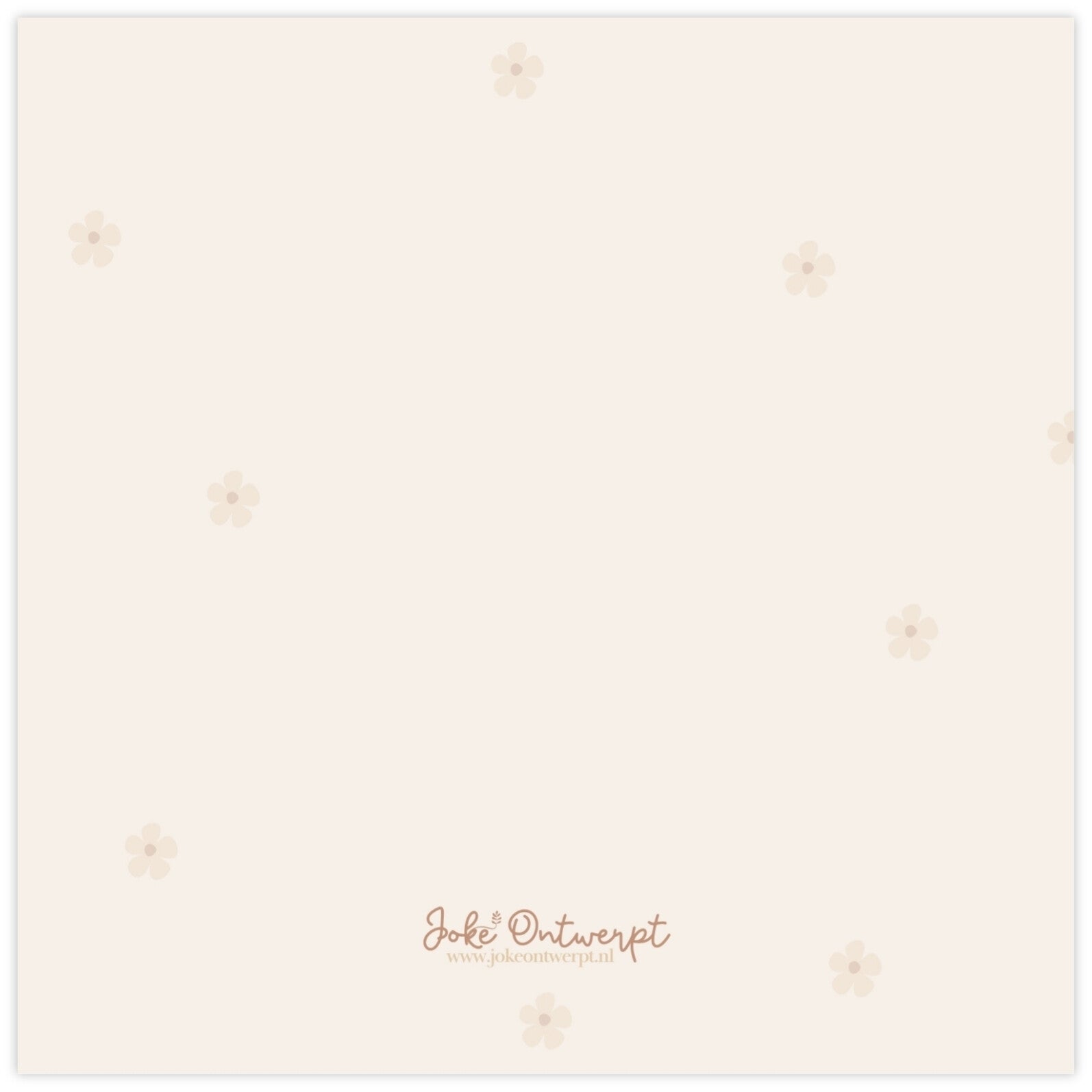 Deze lieve bloemenbeer‑geboortekaart kan volledig worden aangepast met de naam, geboortedatum en alle andere gegevens aan de binnenkant van de kaart. Het ontwerp aan de buitenkant blijft hetzelfde, zodat de stijl mooi en rustig blijft. Zo ontvangen jullie een uniek kaartje dat helemaal past bij jullie kindje.