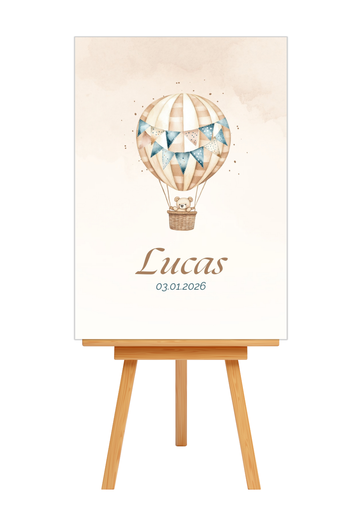 Dit warme A6 geboorte‑ontwerp toont een lieve teddybeer in een luchtballon, omringd door zachte, harmonieuze tinten. De rustige lijnen en aquarel‑details geven het geheel een dromerige, serene uitstraling — perfect om de komst van jullie kleintje te vieren.